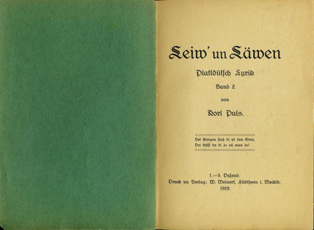 Puls, Karl: Leiw' un Läwen. Plattdütsch Lyrik, (Licht un Schatten) 2, Lübtheen, W. Meinert, 1929, S. 80.