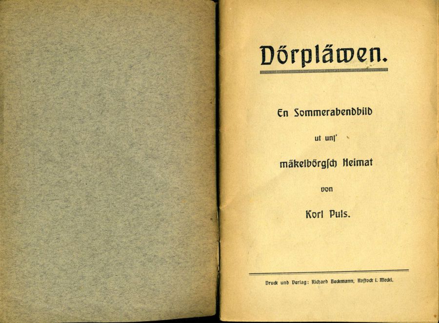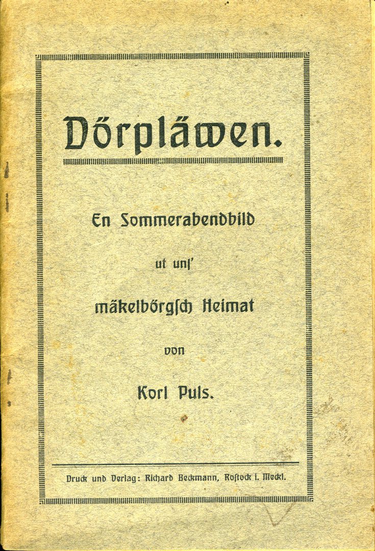 Puls, Karl: Dörpläwen. En Sommerabendbild ut uns mäkelbörgsch Heimat, Postock, Verlag Richard Beckmann 1924, 47 S.