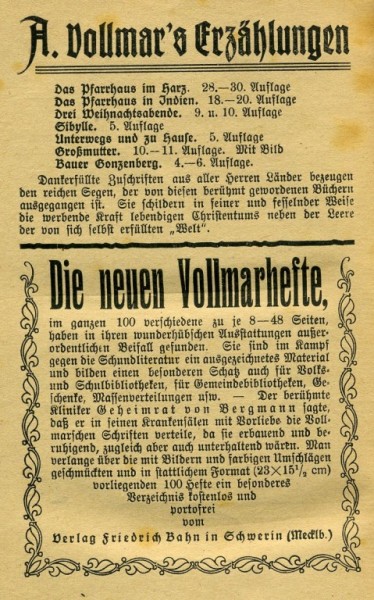 Vollmar, A(gnes): Das Pfarrhaus in Indien. Erzählung, Schwerin, Verlag Friedrich Bahn, 22. Aufl., S. 243.