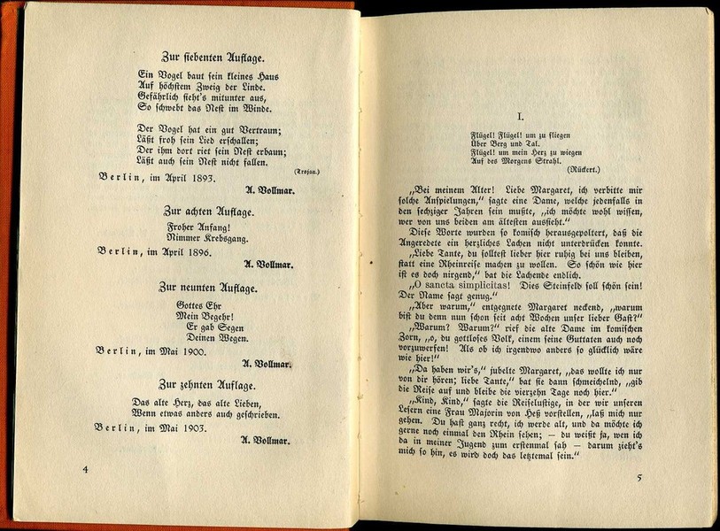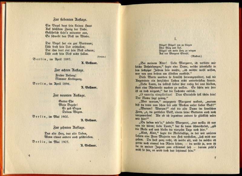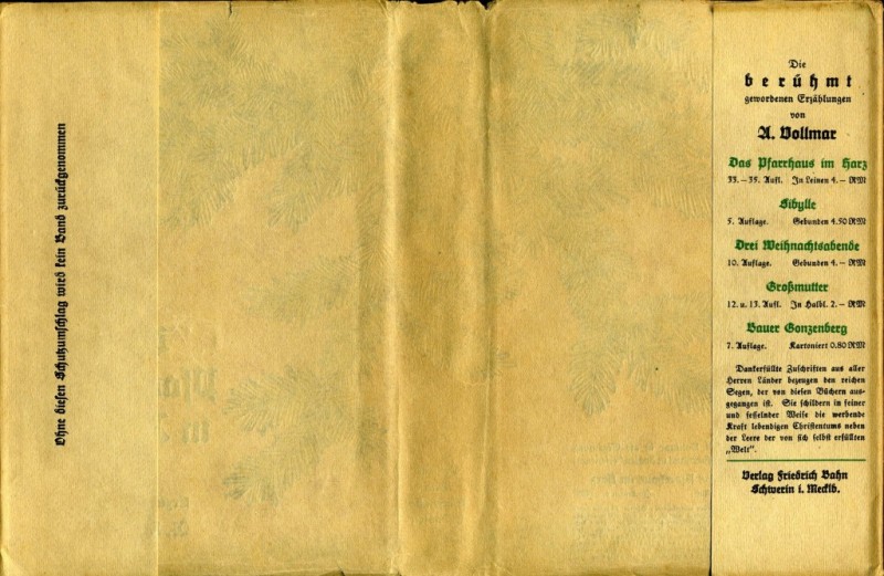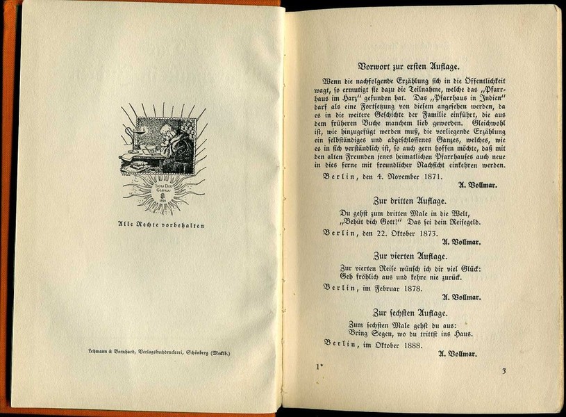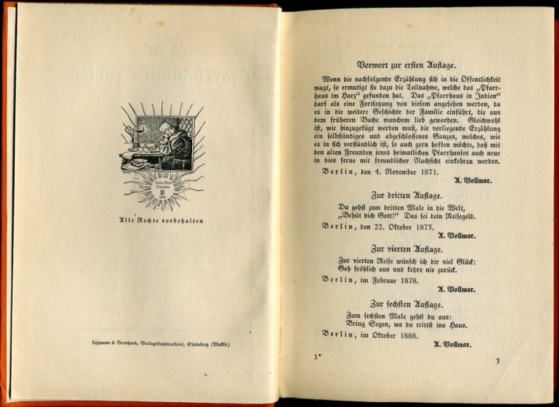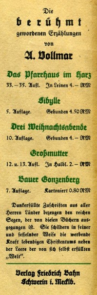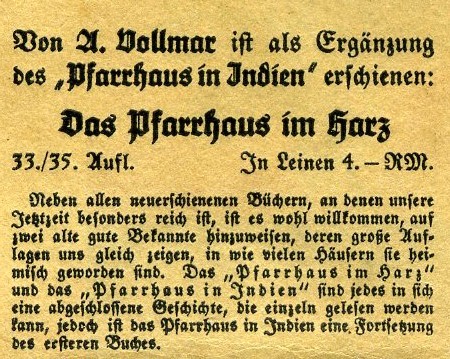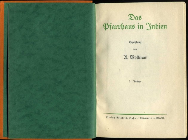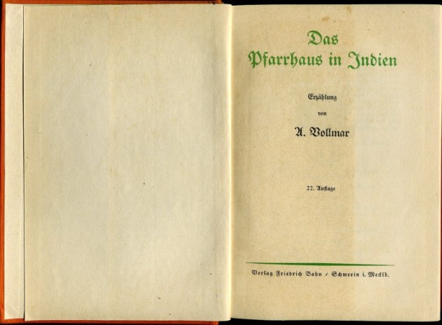 Vollmar, A(gnes): Das Pfarrhaus in Indien. Erzählung, Schwerin, Verlag Friedrich Bahn, 1923, 19. Aufl., S. IV, 331.