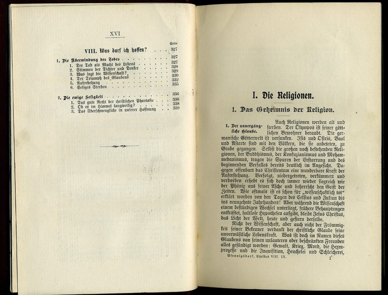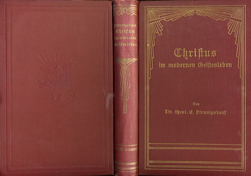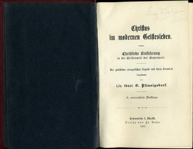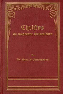 Pfennigsdorf, E(mil): Christus im modernen Geistesleben. christliche Einführung in die Geisteswelt der Gegenwart. Der gebildeten evangelischen Jugend und ihren Freunden dargeboten, Schwerin, Verlag Friedrich Bahn 1905, 8. Aufl., S. XVI, 340.