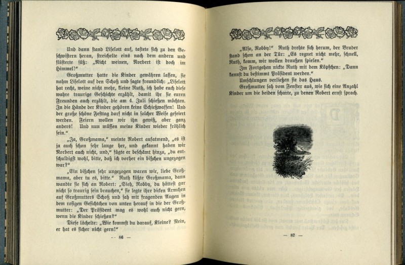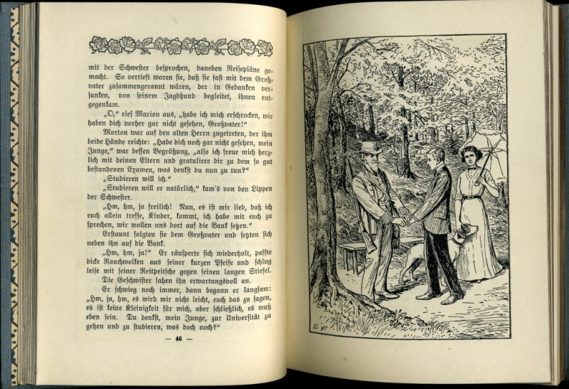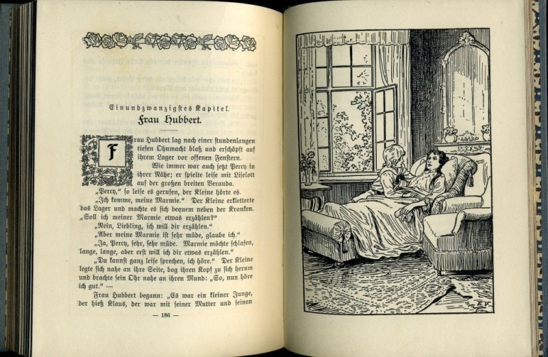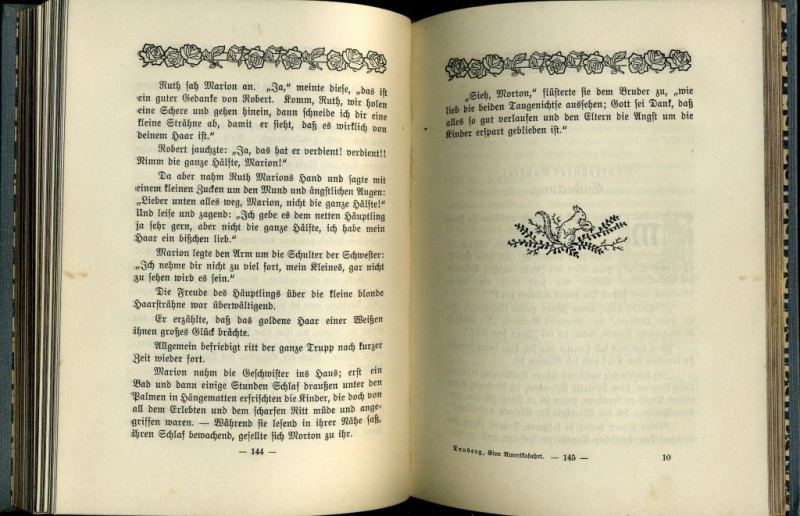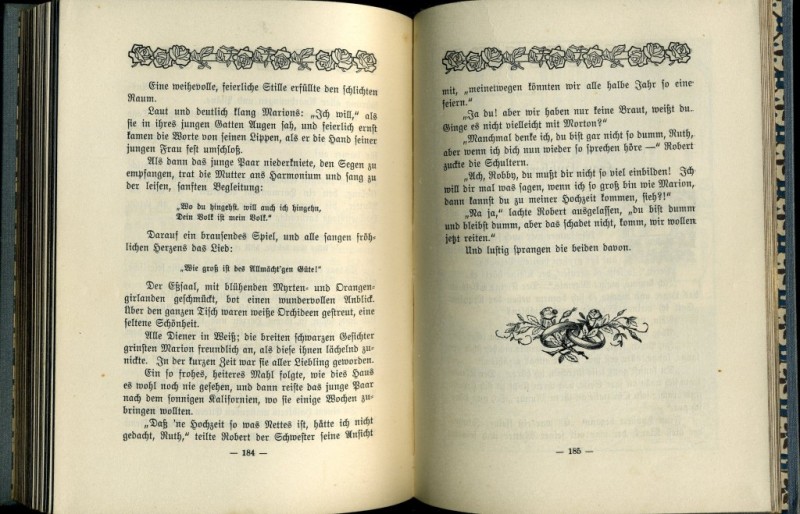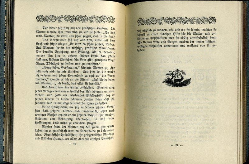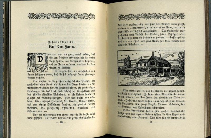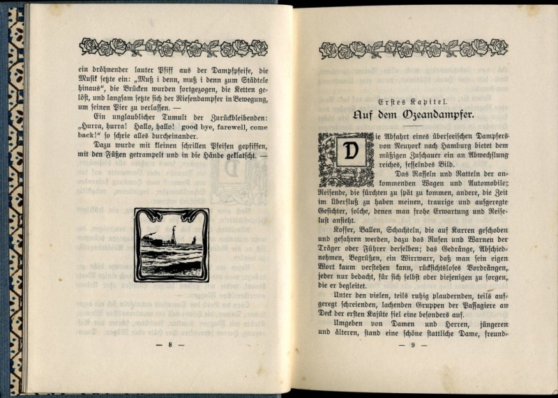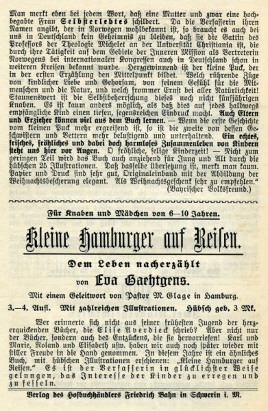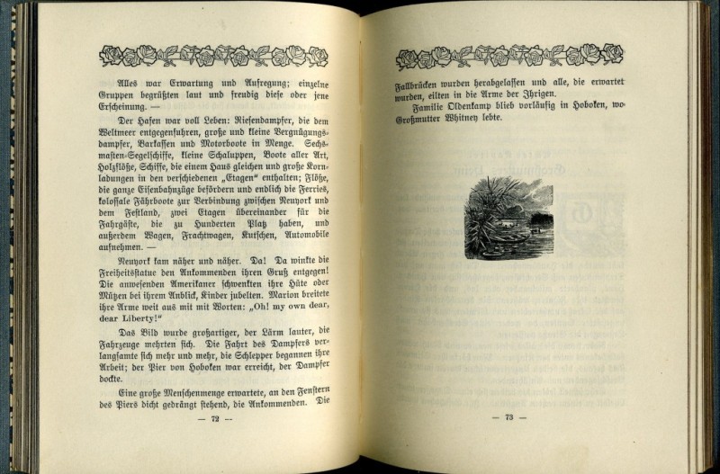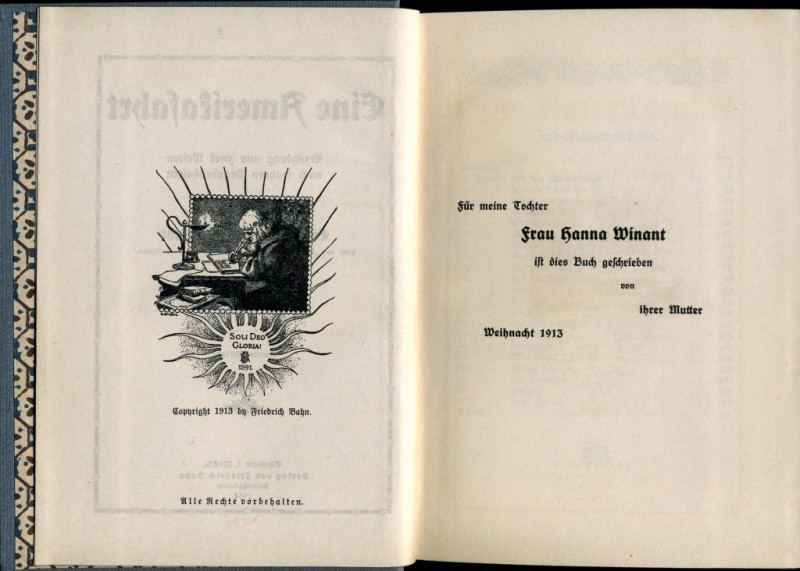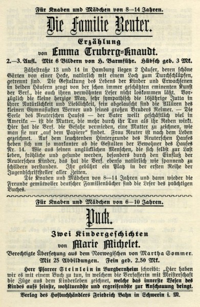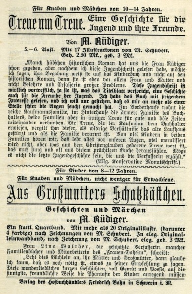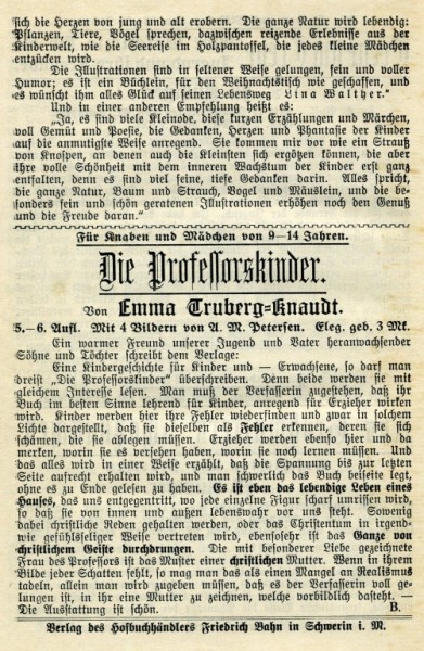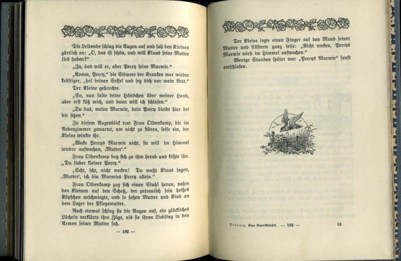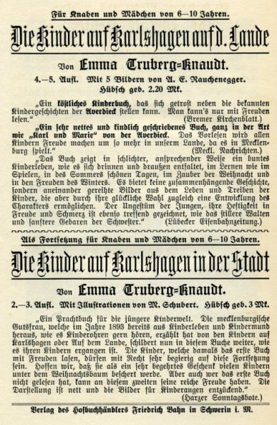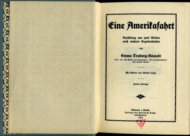 Truberg-Knaudt, Emma: Eine Amerikafahrt. Erzählung aus zwei Welten nach wahren Begebenheiten. Mit Bildern von Elisabet Voigt, Schwerin, Verlag Friedrich Bahn 1914 (2. Aufl.), S. 201.