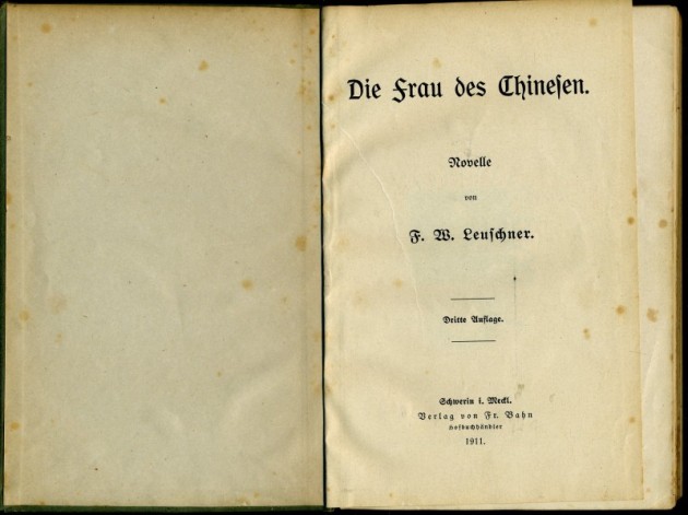 Leuschner, F(riedrich) W(ilhelm): Die Frau des Chinesen. Novelle, Schwerin, Verlag Friedrich Bahn 1911 (3. Aufl.), S. 199.