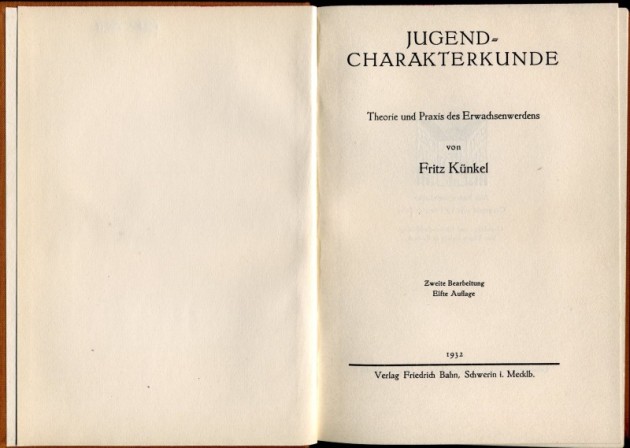 Künkel, Fritz: Jugendcharakterkunde. Theorie und Praxis des Erwachsenwerdens. 2. Bearbeitung, Schwerin, Verlag Friedrich Bahn 1932 (11. Aufl.), S. 128.